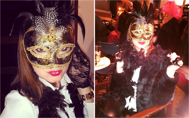 Eu não me disfarcei à séria. Usei, apenas, uma máscara de Veneza, luvas de renda e um cachecol de plumas. O meu namorado disfarçou-se de Zorro.