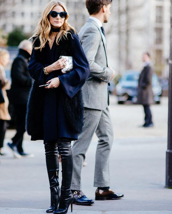Outro total black (ou será black e marinho?), num conjunto que nunca desilude. Vestido fluído + colete de pêlo + botas over the knee.